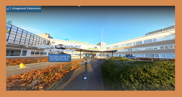 Maar we hebben nu ook onze eigen virtuele tour! Hier kun je zelf rondlopen op de verloskamers, kraamafdeling en kinderafdeling van het Slingeland Ziekenhuis. Op de verschillende kamers zijn voorlichtingsfilmpjes te zien, onder andere over: de normaal verlopende bevalling, het inleiden van de bevalling, het breken van de vliezen, een bevalling met een vacuümpomp, pijnstilling, keizersnede en borst- of flesvoeding. Daarnaast is de looproute vanuit de nachtingang te bekijken. Deze informatie vervangt onze voorlichtingsavond die voorheen iedere maand in het ziekenhuis werd georganiseerd.